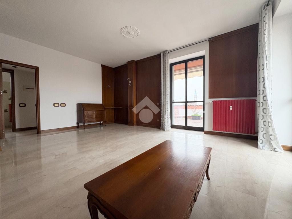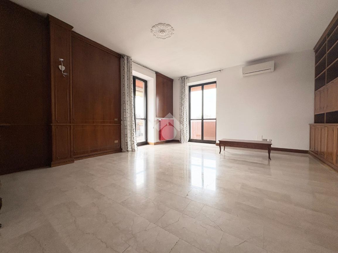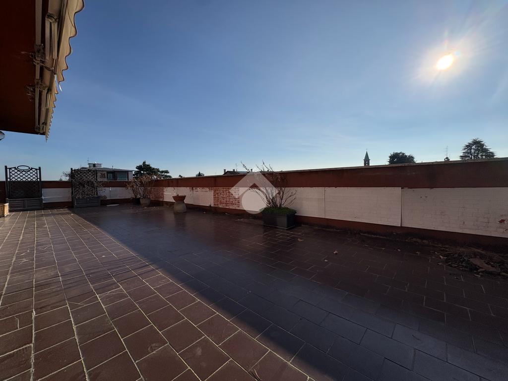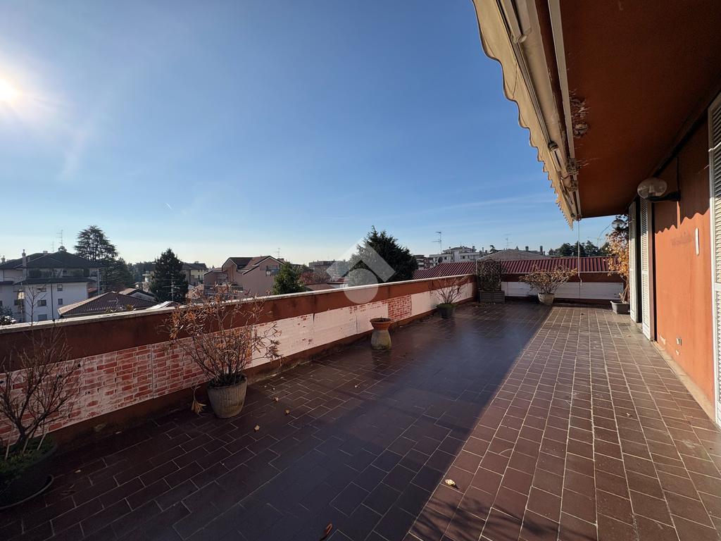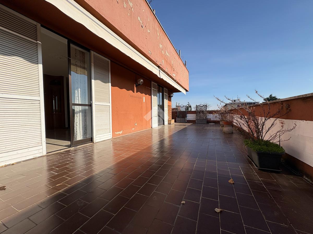 In un tranquillo contesto residenziale signorile, proponiamo un esclusivo trilocale molto luminoso. L'appartamento di 100 mq si trova al quarto piano, servito da ascensore, e si distingue per la presenza di un eccezionale terrazzo di altrettanti 93 mq. Sviluppato su tre lati, l''incredibile terrazzo regala una vista panoramica aperta e ampi spazi da vivere in ogni stagione: ideale per chi ama pranzi e cene all'aperto, momenti di relax al sole, o per chi desidera creare un'area verde privata in città. L'ingresso conduce all'ampio soggiorno caratterizzato da una splendida luminosità grazie alla doppia esposizione e con accesso diretto al terrazzo. Un primo disimpegno porta alla cucina abitabile facilmente trasformabile in una terza camera, anch'essa con accesso al terrazzo, oltre al primo bagno finestrato e alla cameretta, dotata di balcone collegato al terrazzo. Un secondo disimpegno introduce alla spaziosa camera matrimoniale, servita da un ulteriore balcone collegato all'area esterna, e al secondo bagno. Completano la proprietà una cantina al piano terra e un box di 16 mq al piano seminterrato. L'immobile è libero subito e rappresenta una soluzione ideale per famiglie che cercano ampi spazi sia interni che esterni, in una zona ben servita: farmacia, scuole, stazione ferroviaria, supermercati e parchi sono tutti facilmente raggiungibili. La centrale termica è stata completamente riqualificata nel 2024, garantendo un miglioramento dell'efficienza energetica.