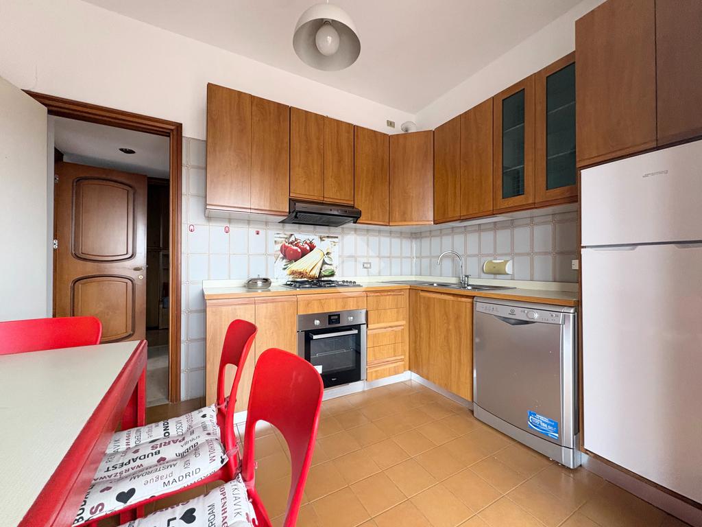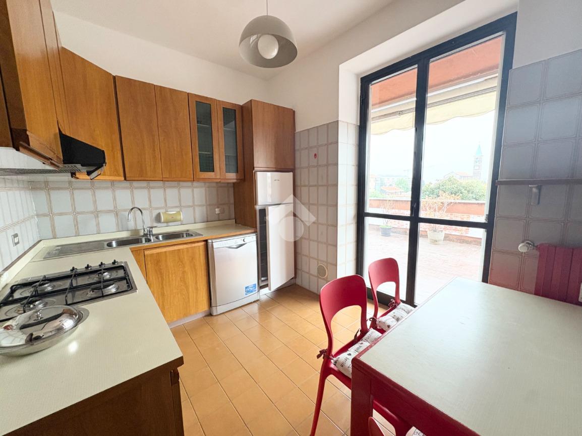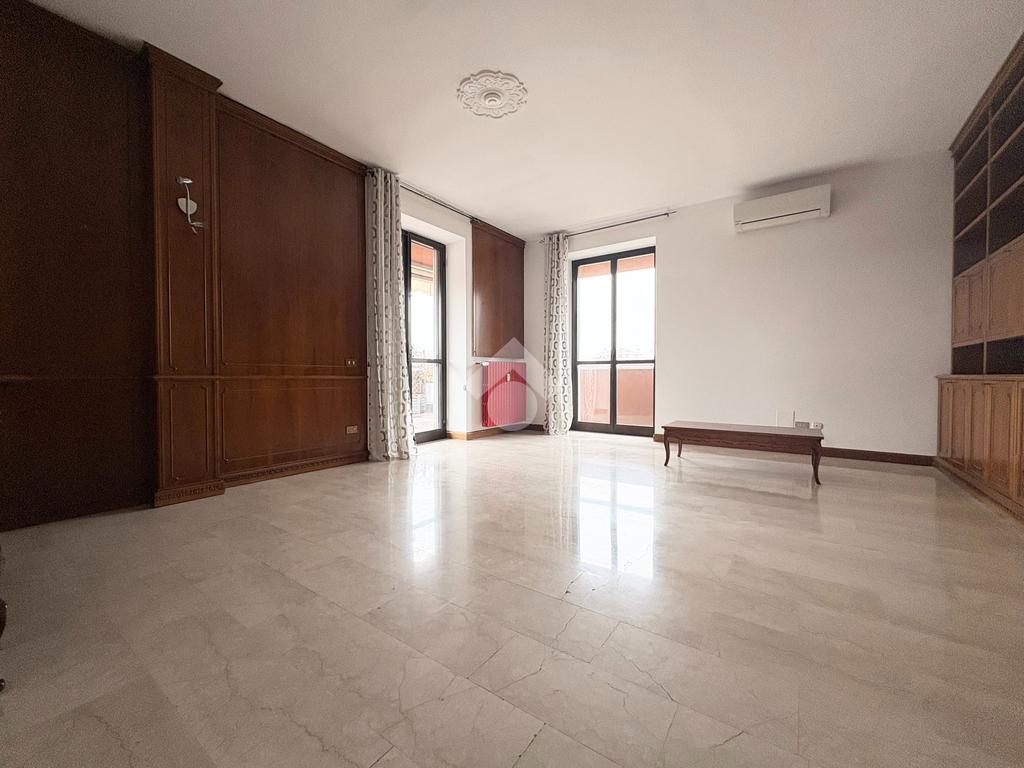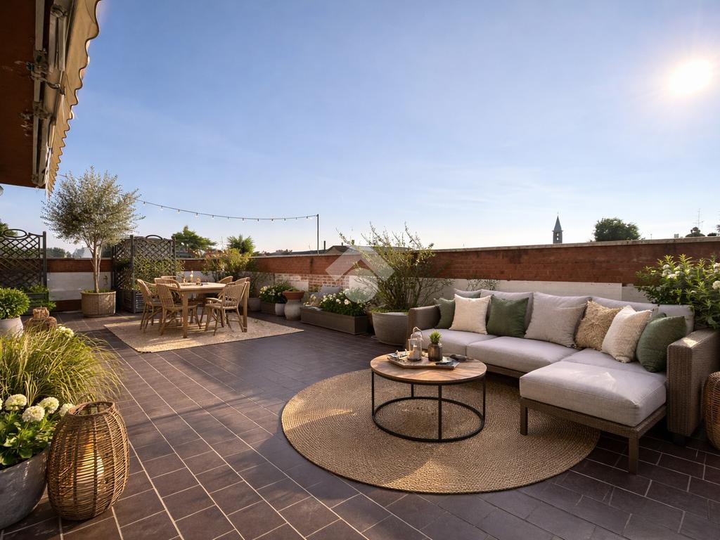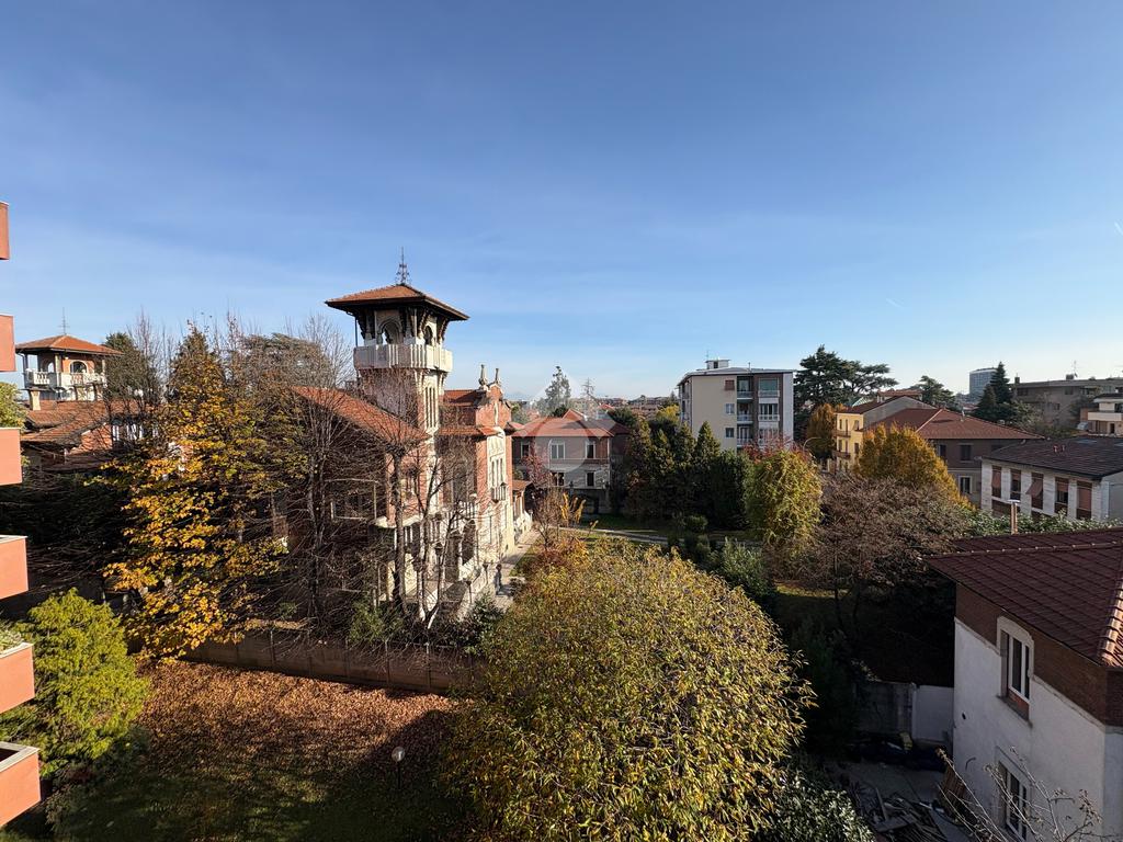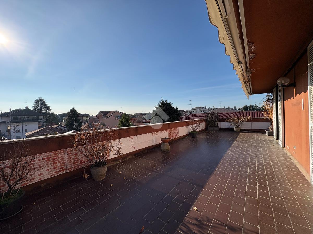 In un tranquillo contesto residenziale signorile, proponiamo un esclusivo trilocale molto luminoso. L'appartamento di 100 mq si trova al quarto piano, servito da ascensore, e si distingue per la presenza di un eccezionale terrazzo di altrettanti 93 mq. Sviluppato su tre lati, l''incredibile terrazzo regala una vista panoramica aperta e ampi spazi da vivere in ogni stagione: ideale per chi ama pranzi e cene all'aperto, momenti di relax al sole, o per chi desidera creare un'area verde privata in città. L'ingresso conduce all'ampio soggiorno caratterizzato da una splendida luminosità grazie alla doppia esposizione e con accesso diretto al terrazzo. Un primo disimpegno porta alla cucina abitabile facilmente trasformabile in una terza camera, anch'essa con accesso al terrazzo, oltre al primo bagno finestrato e alla cameretta, dotata di balcone collegato al terrazzo. Un secondo disimpegno introduce alla spaziosa camera matrimoniale, servita da un ulteriore balcone collegato all'area esterna, e al secondo bagno. Completano la proprietà una cantina al piano terra e un box di 16 mq al piano seminterrato. L'immobile è libero subito e rappresenta una soluzione ideale per famiglie che cercano ampi spazi sia interni che esterni, in una zona ben servita: farmacia, scuole, stazione ferroviaria, supermercati e parchi sono tutti facilmente raggiungibili. La centrale termica è stata completamente riqualificata nel 2024, garantendo un miglioramento dell'efficienza energetica.